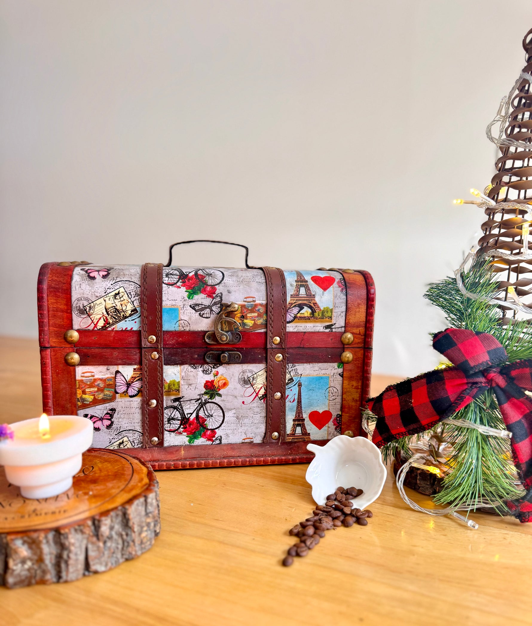 Este encantador baúl de estilo vintage combina colores vibrantes, ilustraciones románticas y acabados artesanales que lo convierten en una pieza única. Ideal para regalos especiales, decoraciones navideñas o como toque distintivo en cualquier espacio.