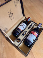Un exclusivo set de regalo que combina dos botellas de vino cuidadosamente seleccionadas, presentadas en un estuche rígido tipo maletín con acabados de lujo. Incluye accesorios esenciales para el ritual perfecto del vino: destapador metálico, tapón decorativo y aro antigoteo.