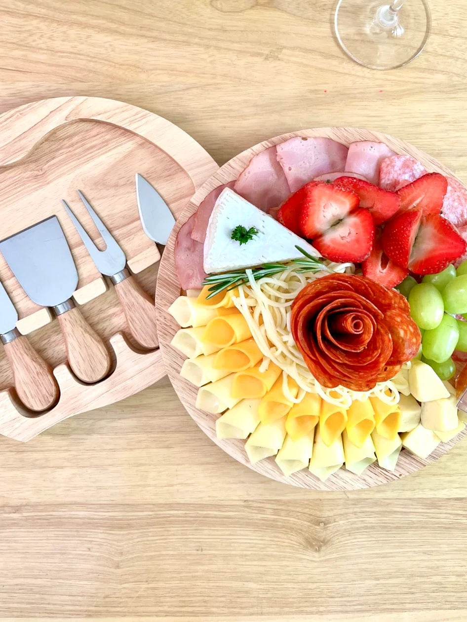 - Lindo set con 4 accesorios para diferentes cortes de quesos
