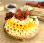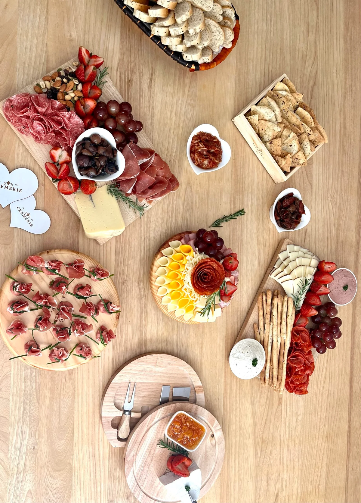 4 variedades de quesos: Queso Brie x 200 grs, Queso Corazón de los Alpes,Queso Manchego – Ibérico (importado), Dip Mediterráneo, Tilsit ahumado y natural, Mozarella.